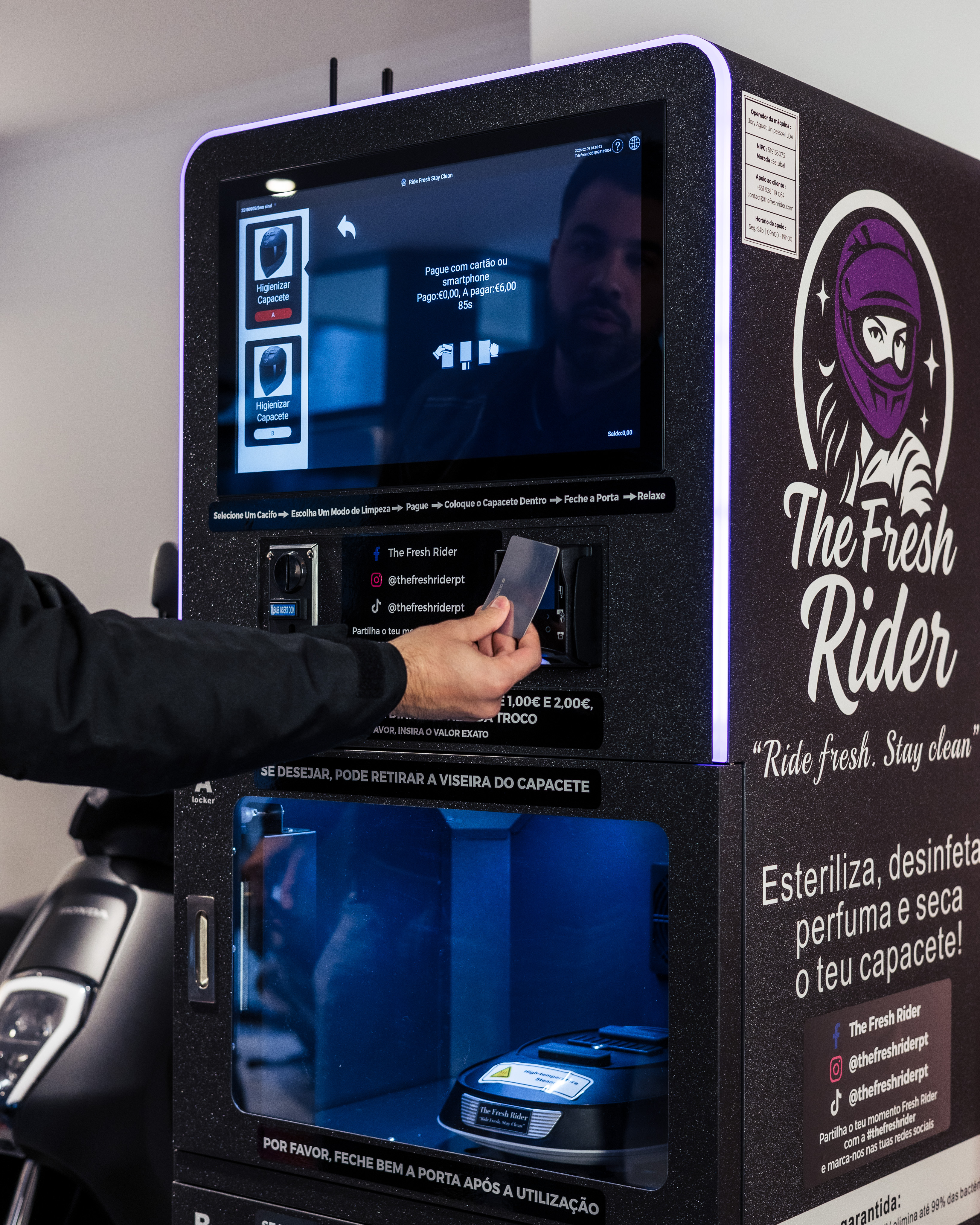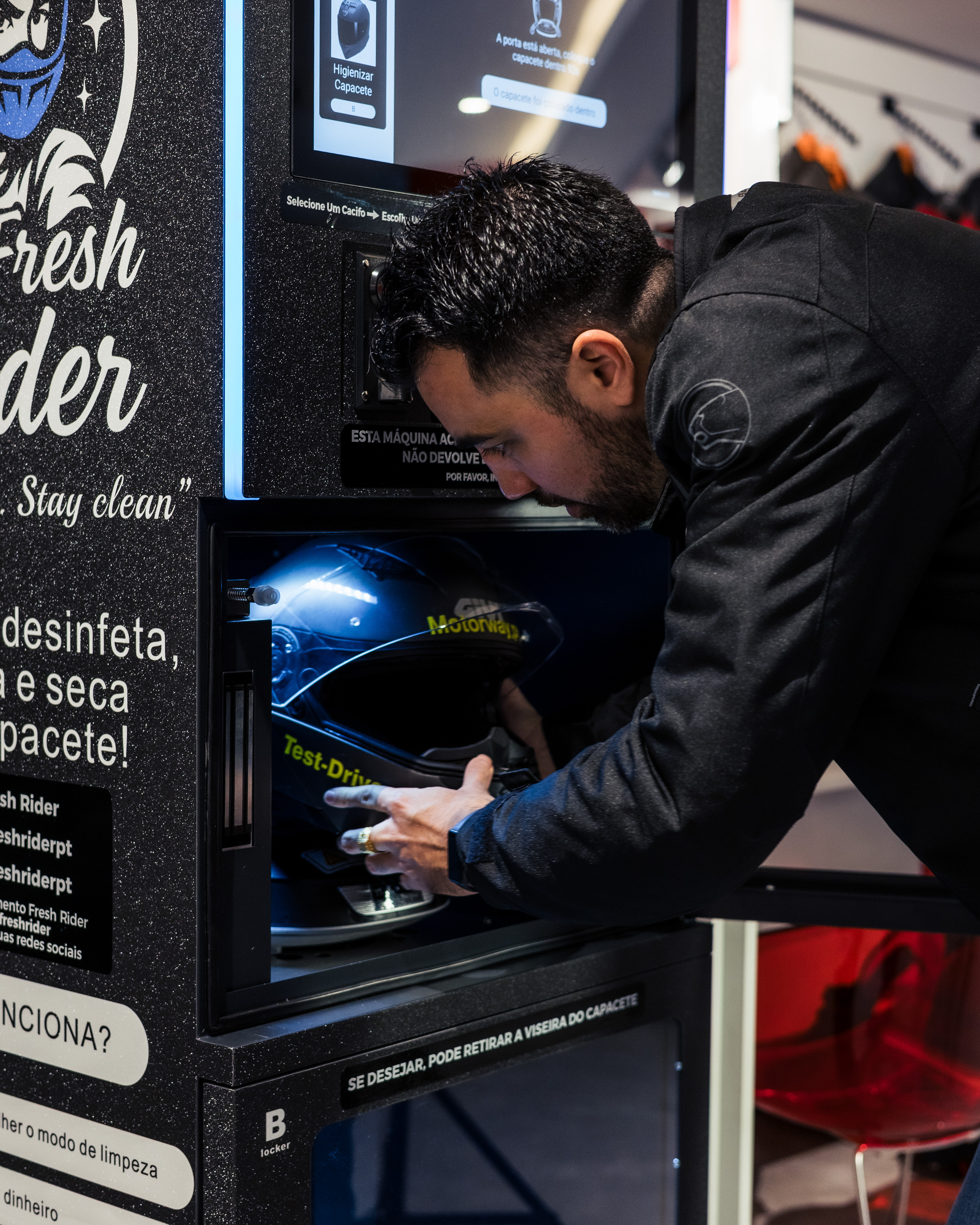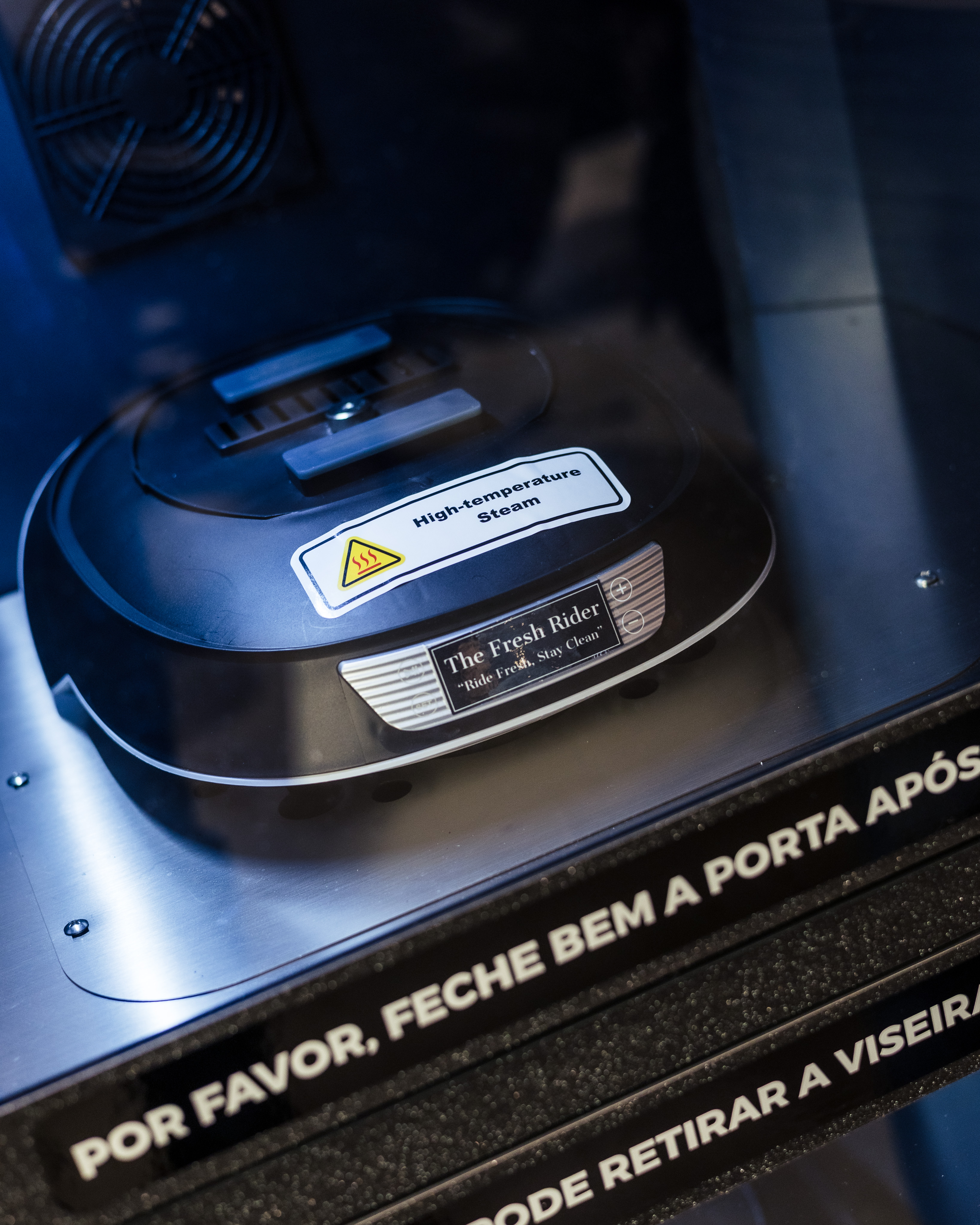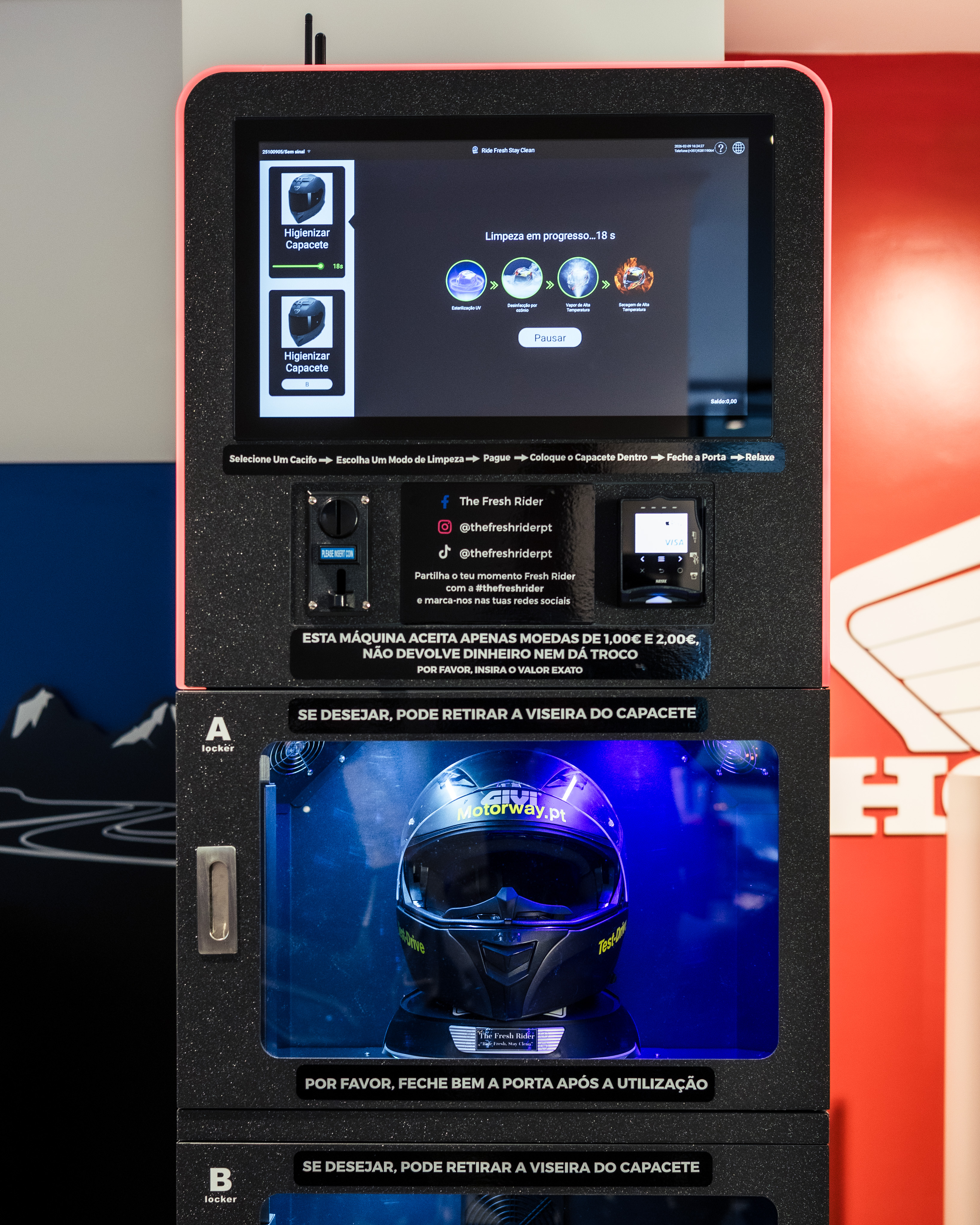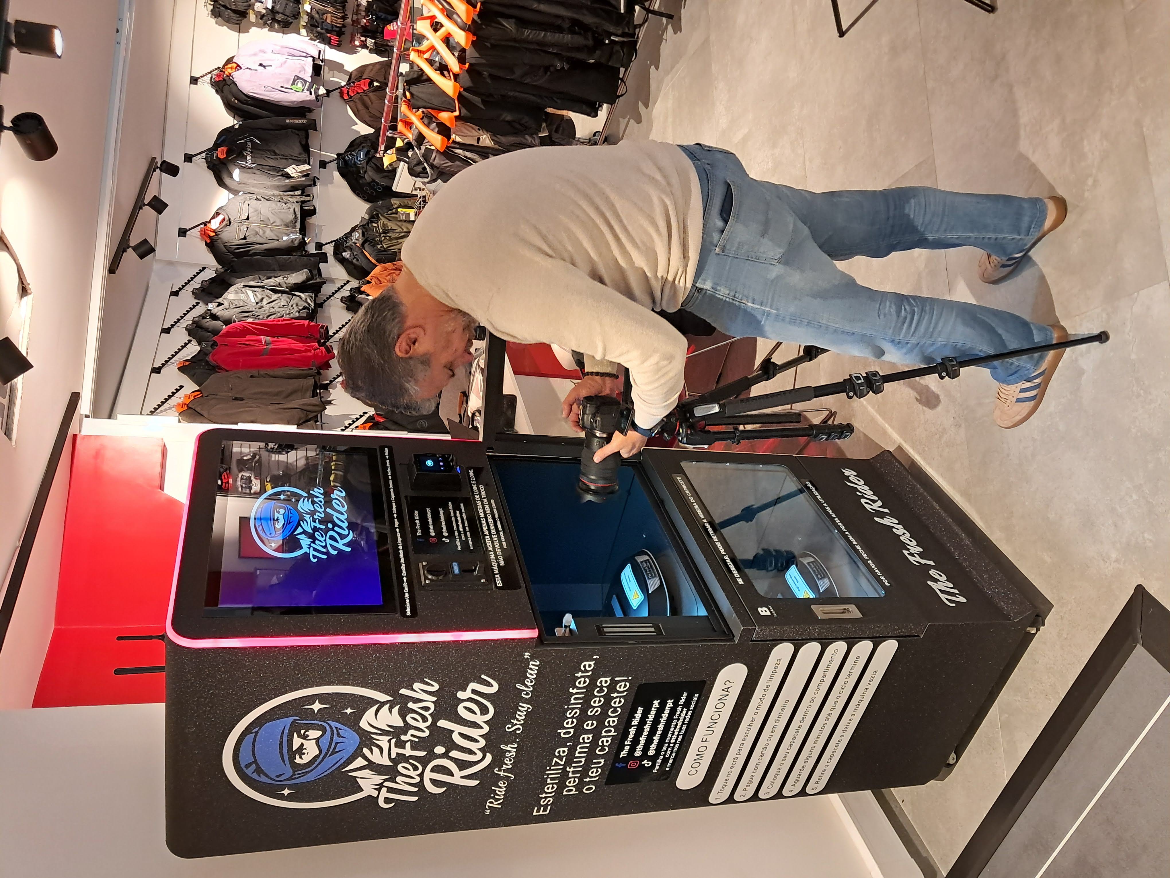 A máquina The Fresh Rider® é um sistema automático self-service que permite higienizar, desinfetar, desodorizar e secar capacetes de moto em poucos minutos.