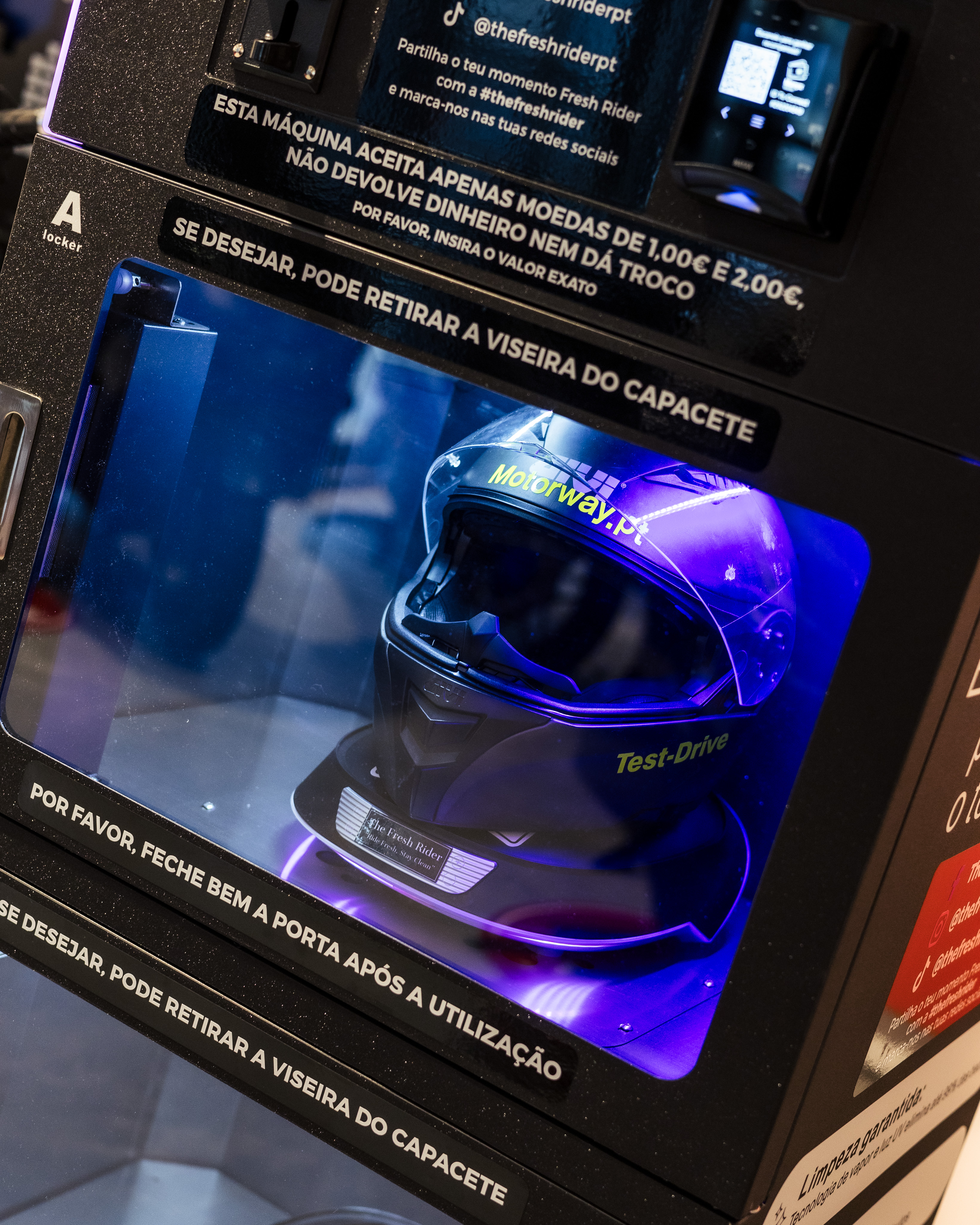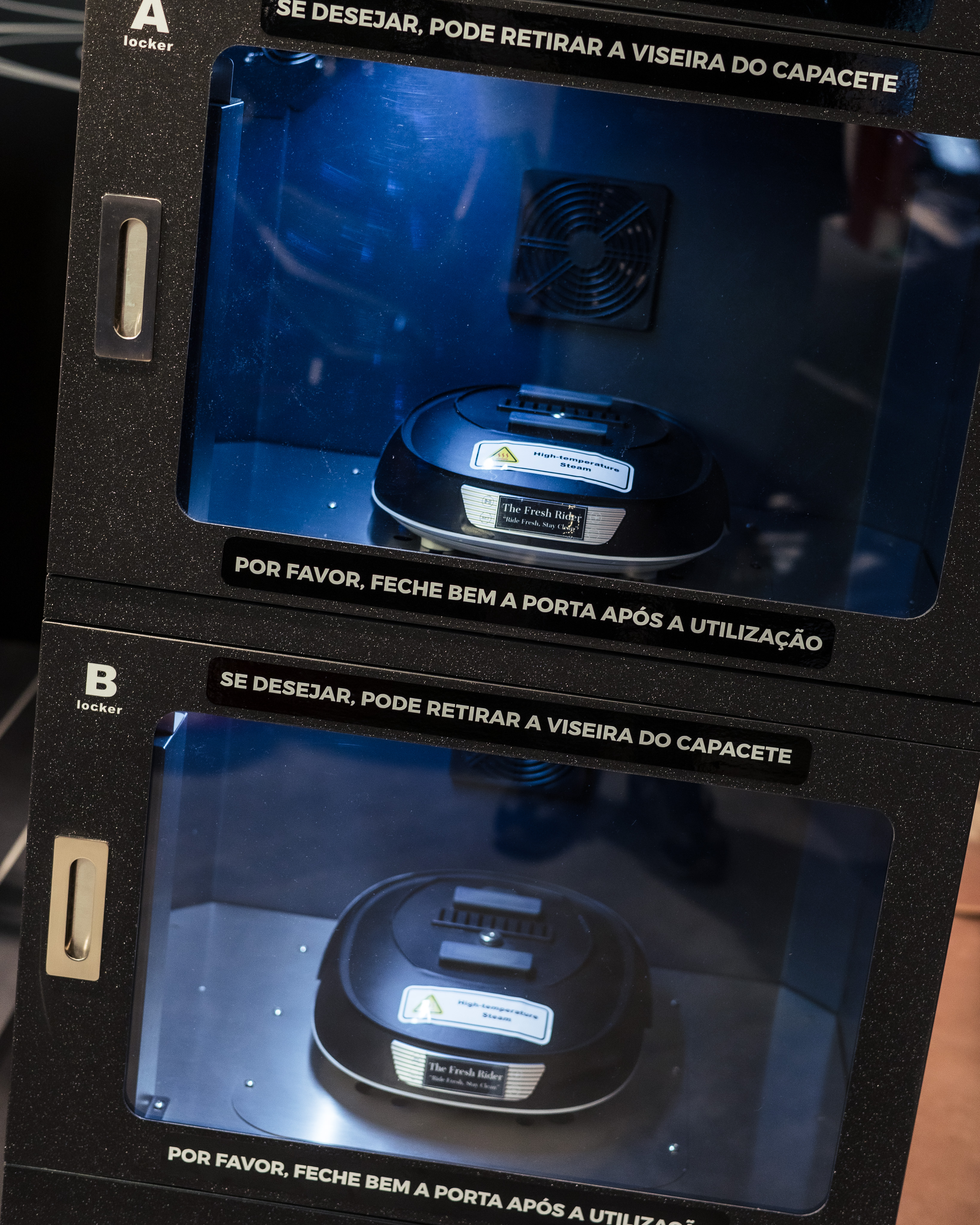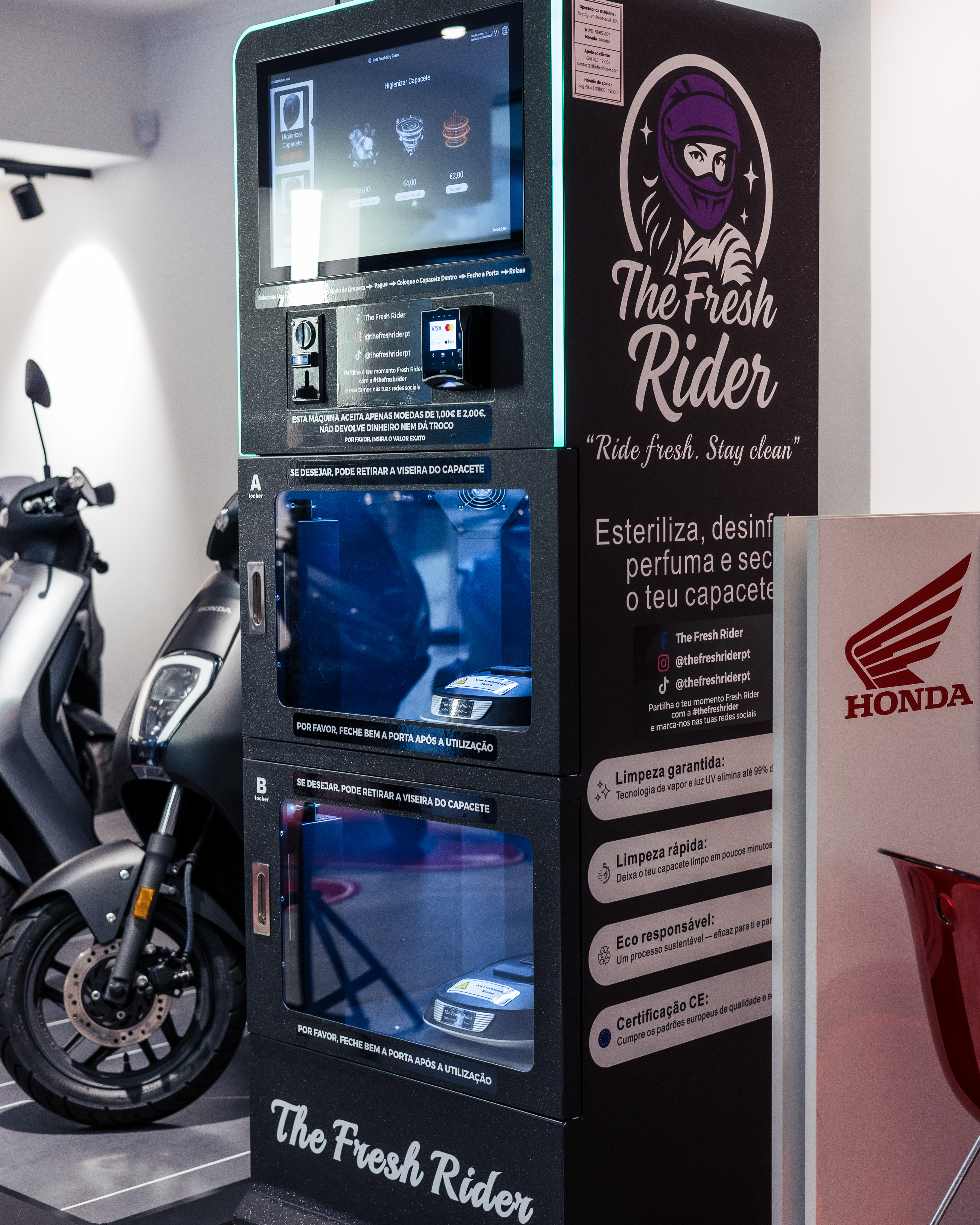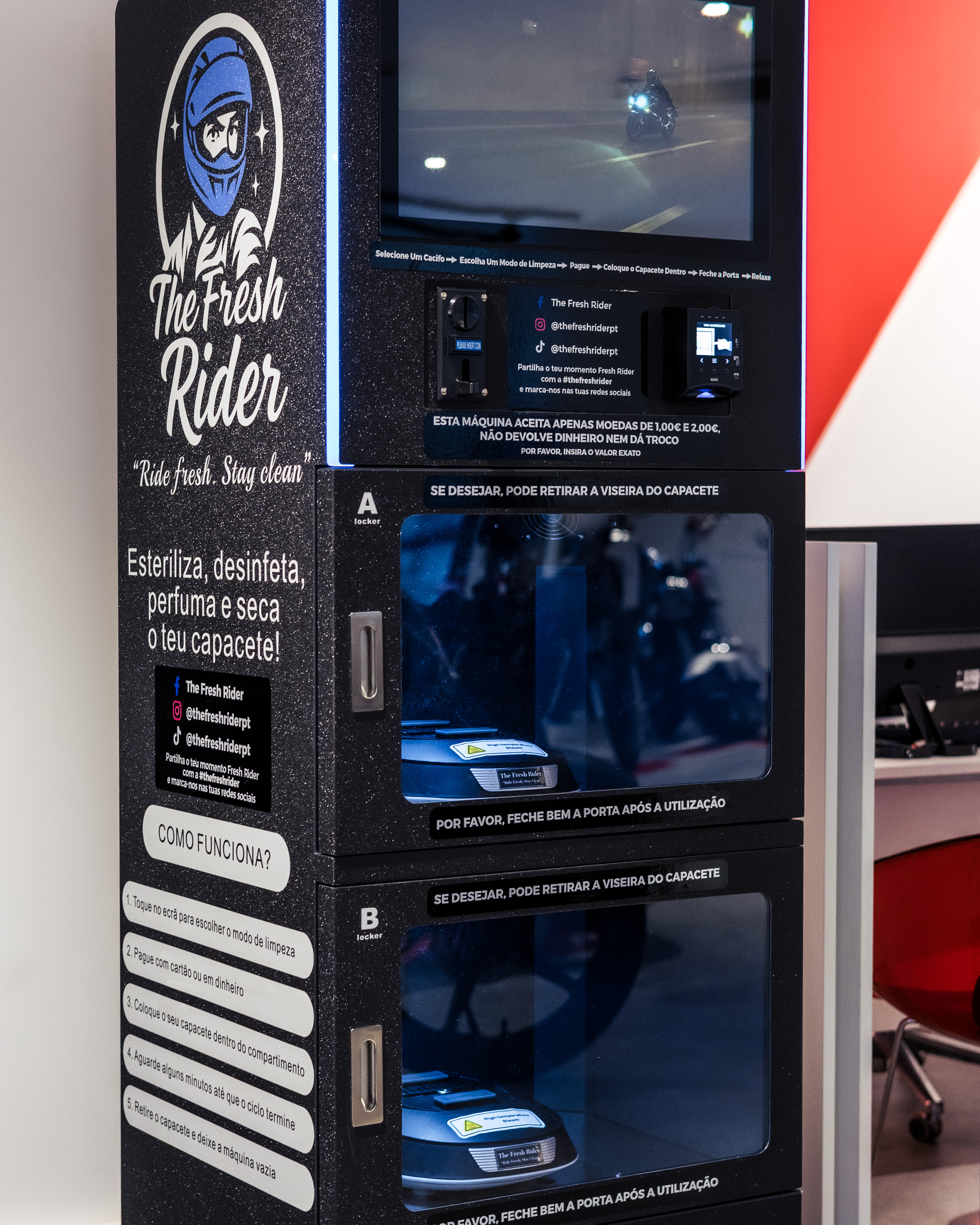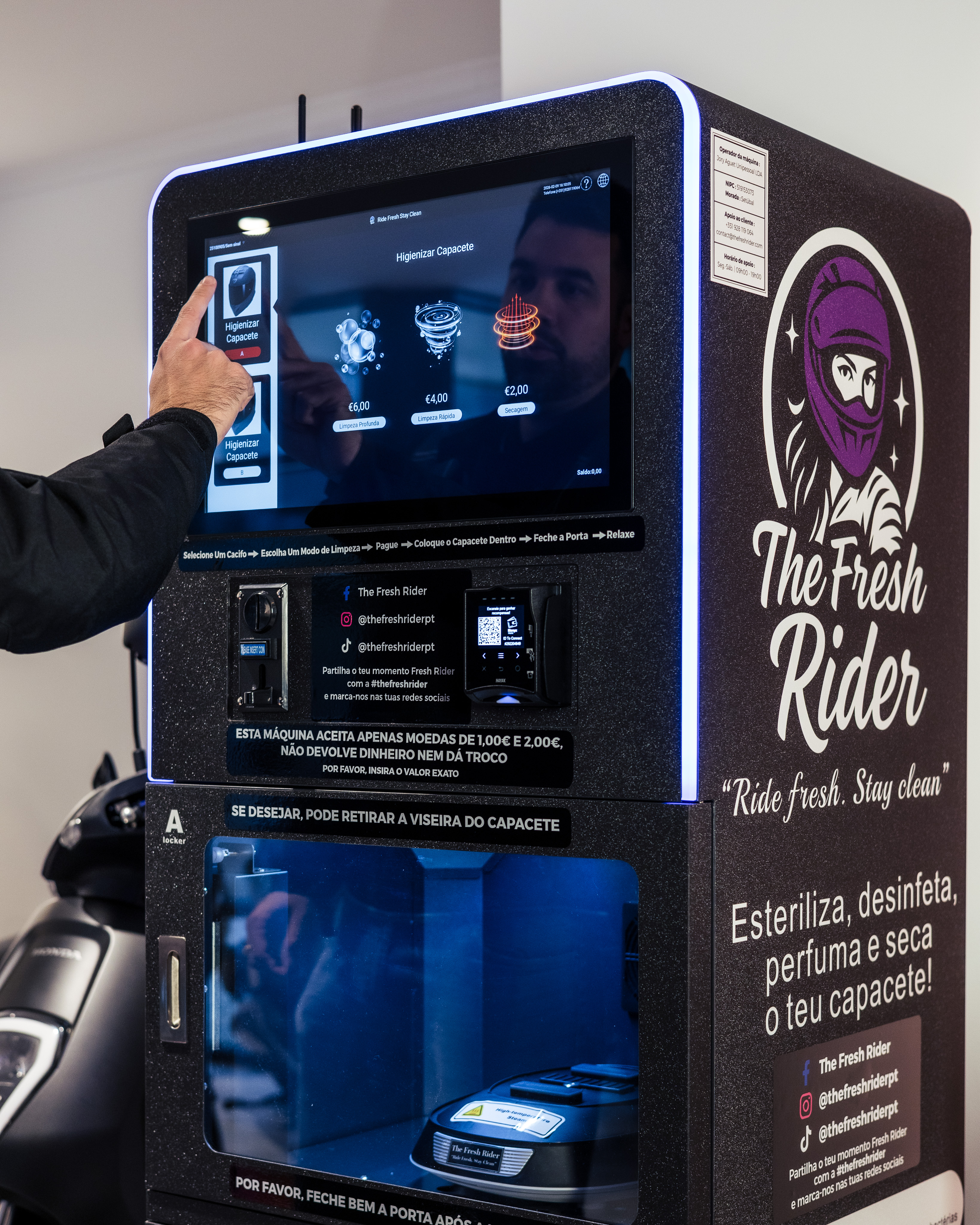 A máquina The Fresh Rider® é um sistema automático self-service que permite higienizar, desinfetar, desodorizar e secar capacetes de moto em poucos minutos.